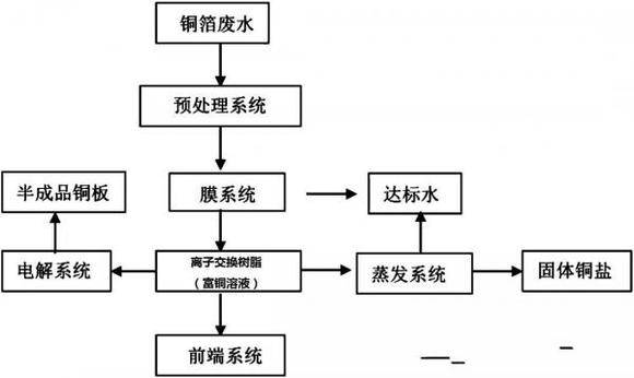 为解决上述技术问题,云沣科技采用离子交换树脂法回收铜技术方案,铜箔废水预处理,对预处理之后的铜箔废水进行逐级浓缩得富铜溶液,富铜溶液回到前端系统重新利用或通过电解富铜溶液中的铜得半成品铜板或通过蒸发系统,把盐分蒸成固体铜盐,回收利用。